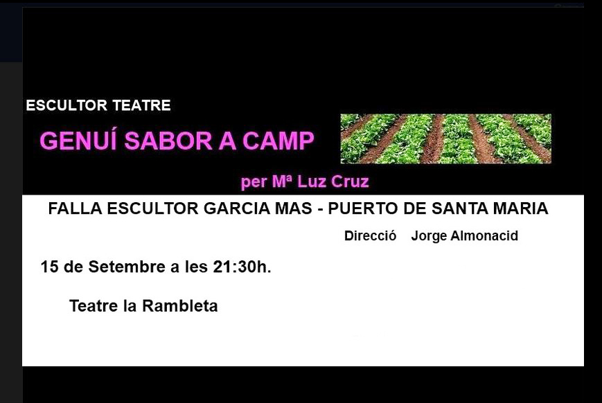Genuino sabor a campo de Mª Luz Cruz- Falla Escultor García Mas septiembre 18, 2017 de mariluzdramaturga Deja un comentario ← Imagen anterior Imagen siguiente → Me gusta Cargando...